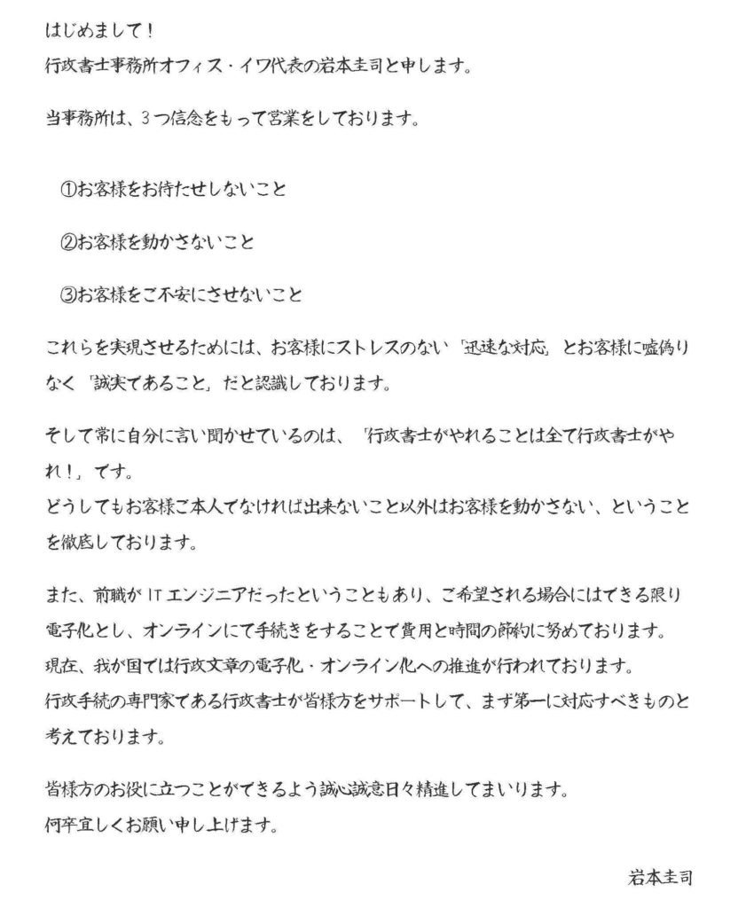 30代も半ばを過ぎていたが一念発起し法律を勉強しはじめ、1年目に宅建士試験、2年目に行政書士試験に合格し、行政書士事務所オフィス・イワを開業。